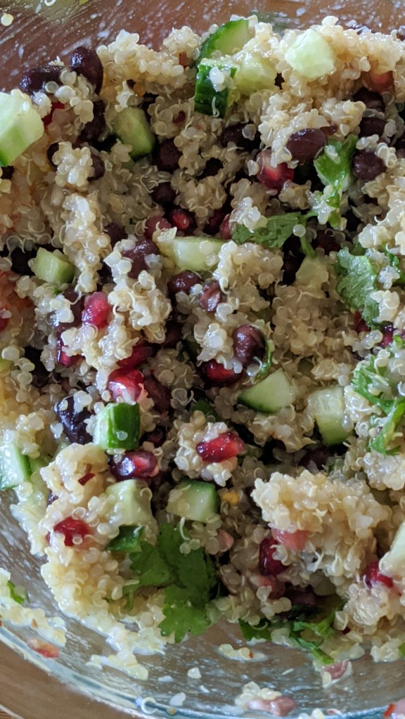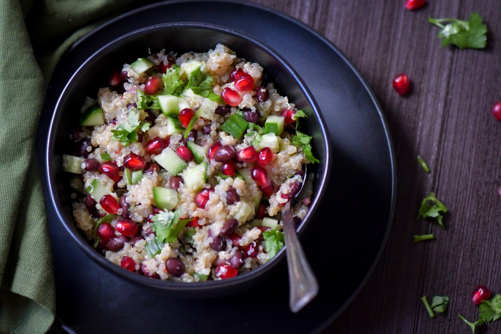 It is really easy to make and quick. You can add pretty much anything with Quinoa to make a bowl or salad. It is combination of warm quinoa with fresh vegetables or beans is what I like the most about it. And I love to spice it up and toss in pomegranate or mango salsa !