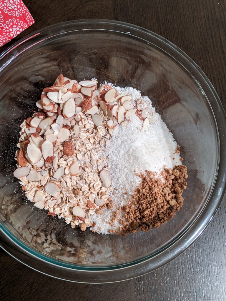 - In a bowl mix in rolled oats, coconut, sugar, slivered almonds, and salt.