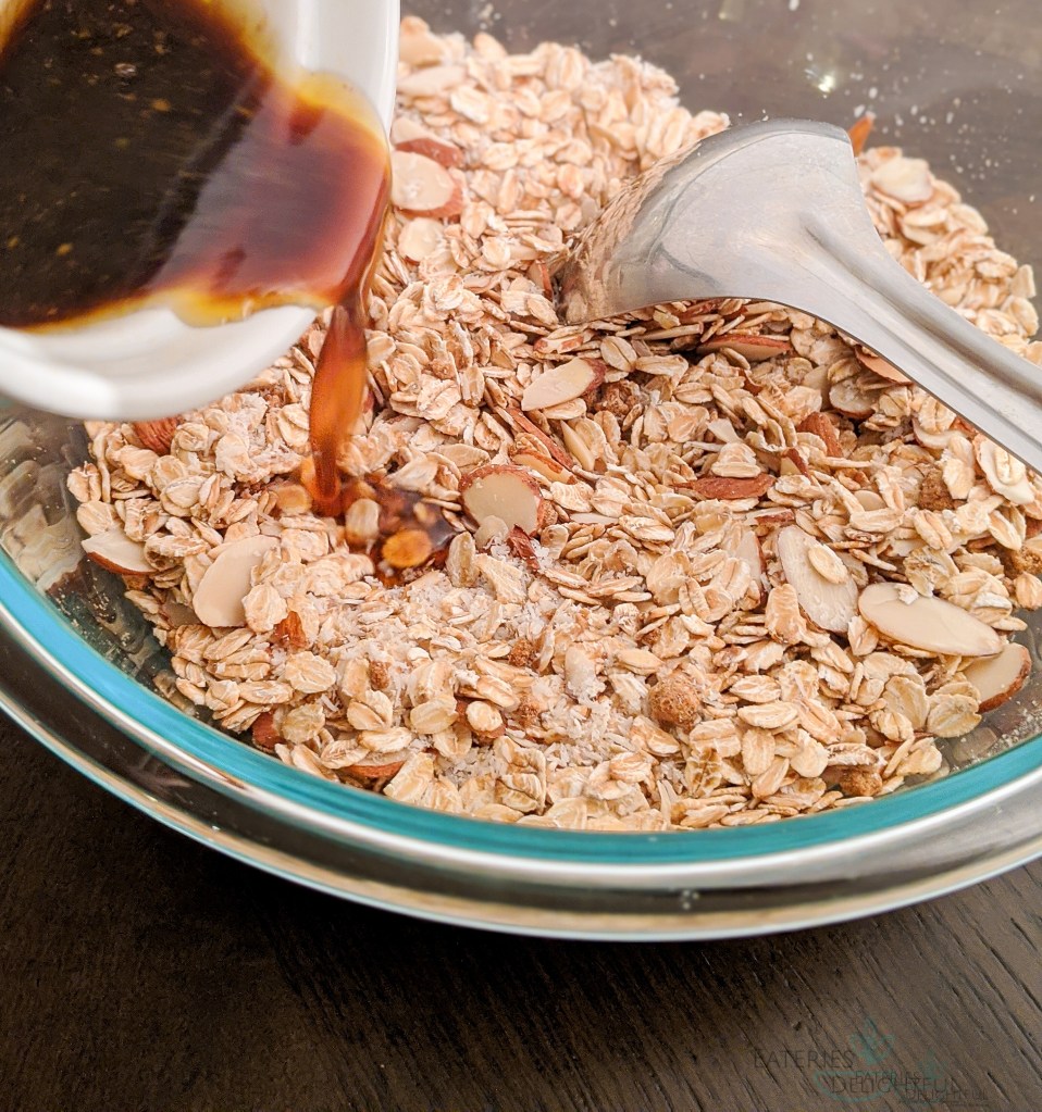 - If you want chunkier granola, do not stir while baking, and thickening the syrup for a while longer helps.