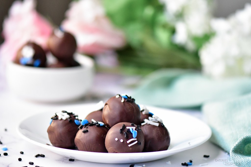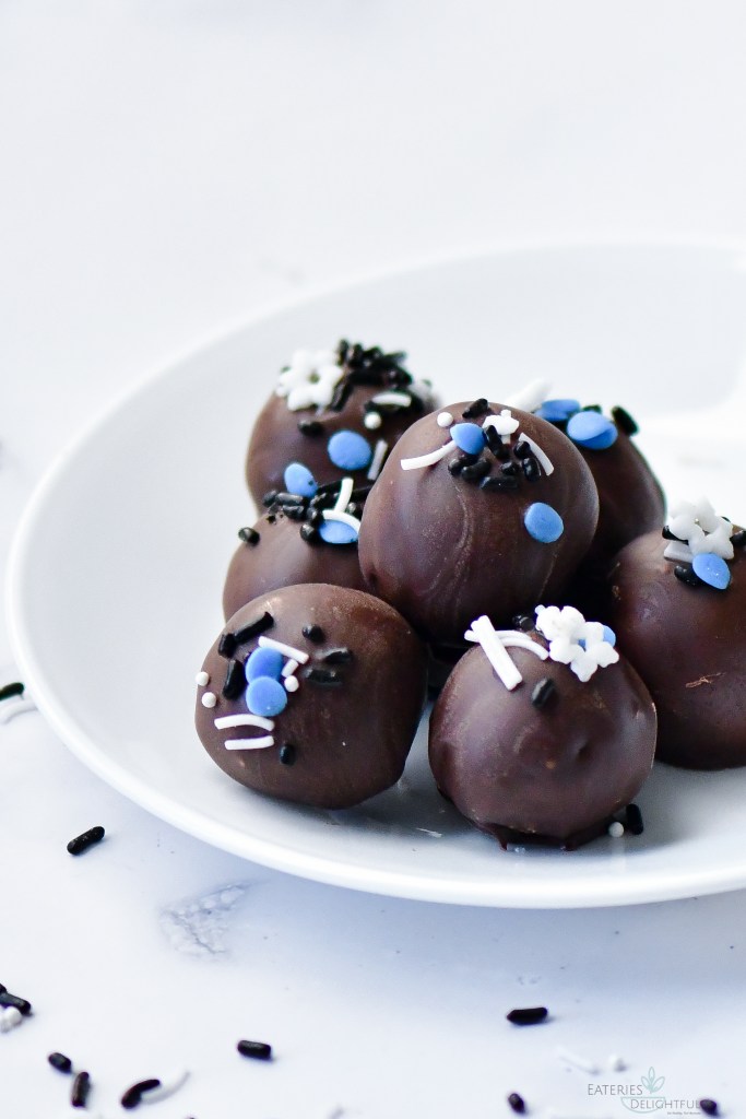 My favorite dessert of all time is Chocolate cake. But the amount of sugar and flour that goes in making cake leaves me looking to have healthier cake bites always. Cake Bites usually involve cake mix, lot of frosting, and candy melts. This recipe is a no bake, has no flour, no refined sugar. It has goodness of oatmeal, almonds, flax seeds, cocoa and sweetened by dates. Finally, these cuties are dipped in pure chocolate melt and studded with sprinkles.